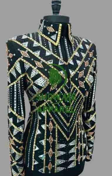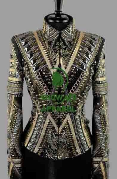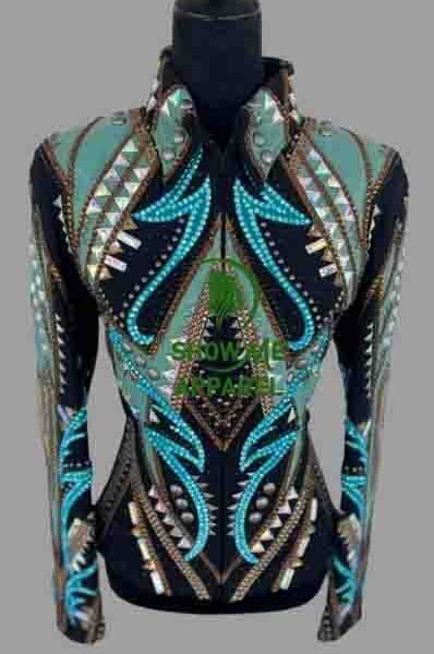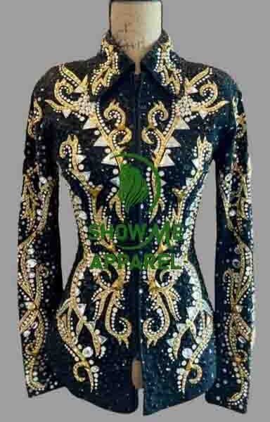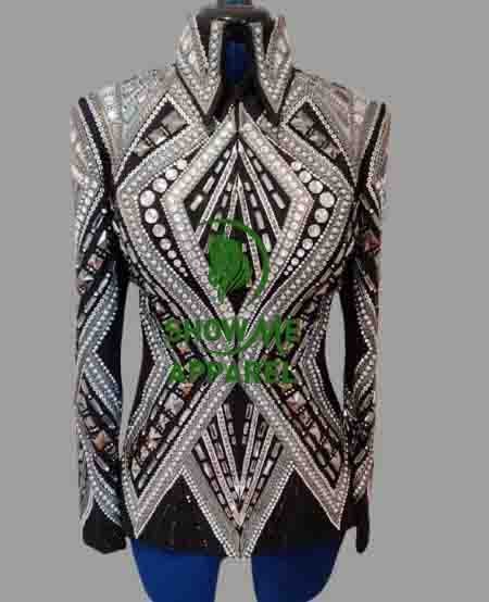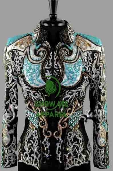 Showmanship Jacket with Black base stretchable fabric. Unique Jewel pieces, with Front hidden zipper S-Jac-17