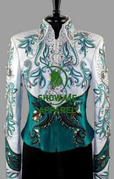 Showmanship Jacket White & Teal base stretchable fabric. Unique Jewel pieces, with Front hidden zipper S-Jac-26