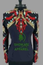 This stunning jacket, made by SHOW ME APPAREL in India, is perfect for any western horse show event. The attention to detail and quality of this jacket is unmatched, making it a must-have for any equestrian enthusiast. The jacket features a beautiful design that is sure to turn heads, and the comfortable fit allows for a full range of motion during your performance. With its timeless style and superior craftsmanship, this jacket is sure to be a showstopper in any arena. Don’t miss out on the opportunity to add this horsemanship jacket to your collection.