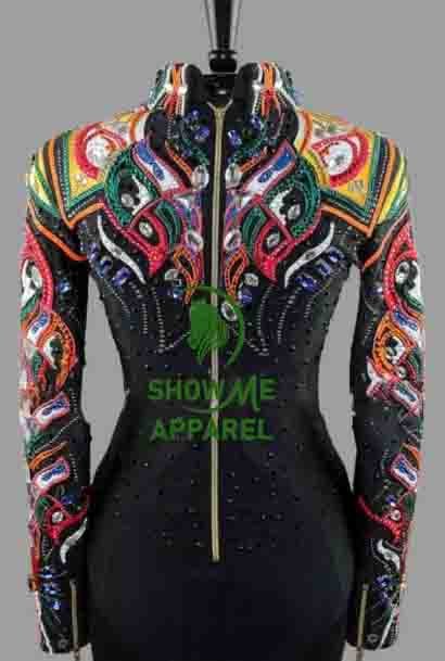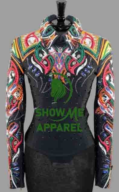 Horsemanship Jacket with Black base stretchable fabric. Unique Jewel pieces, with back hidden zipper Jac-17