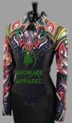 This stunning jacket, made by SHOW ME APPAREL in India, is perfect for any western horse show event. The attention to detail and quality of this jacket is unmatched, making it a must-have for any equestrian enthusiast. The jacket features a beautiful design that is sure to turn heads, and the comfortable fit allows for a full range of motion during your performance. With its timeless style and superior craftsmanship, this jacket is sure to be a showstopper in any arena. Don’t miss out on the opportunity to add this horsemanship jacket to your collection.