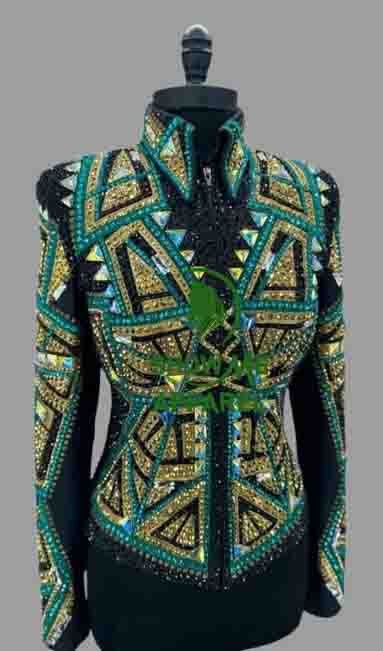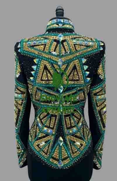 Showmanship Jacket with Black base stretchable fabric. Unique Jewel pieces, with Front hidden zipper S-Jac-21