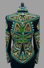 Be the first to review “Showmanship Jacket with Black base stretchable fabric. Unique Jewel pieces, with Front hidden zipper S-Jac-21”