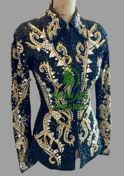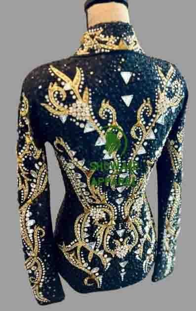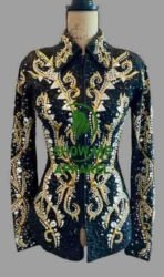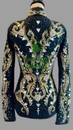 Be the first to review “Showmanship Jacket with Black base stretchable fabric. Unique Jewel pieces, with Front hidden zipper S-Jac-23”