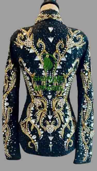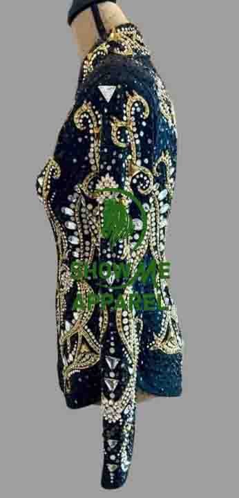 This stunning jacket, made by SHOW ME APPAREL in India, is perfect for any western horse show event. The attention to detail and quality of this jacket is unmatched, making it a must-have for any equestrian enthusiast. The jacket features a beautiful design that is sure to turn heads, and the comfortable fit allows for a full range of motion during your performance. With its timeless style and superior craftsmanship, this jacket is sure to be a showstopper in any arena. Don’t miss out on the opportunity to add this horsemanship jacket to your collection.
