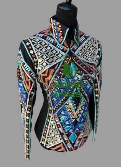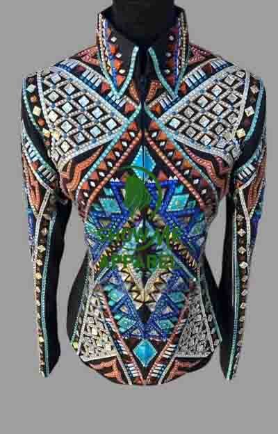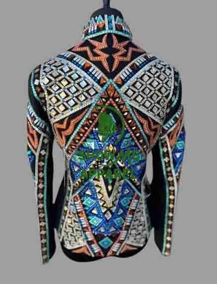Be the first to review “Showmanship Jacket with Black base stretchable fabric. Unique Jewel pieces, with Front hidden zipper S-Jac-36”